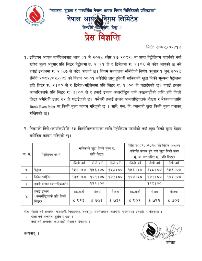 उक्त मूल्य आज राती १२ बजेदेखि लागू निगमले जानकारी दिएको थियो।