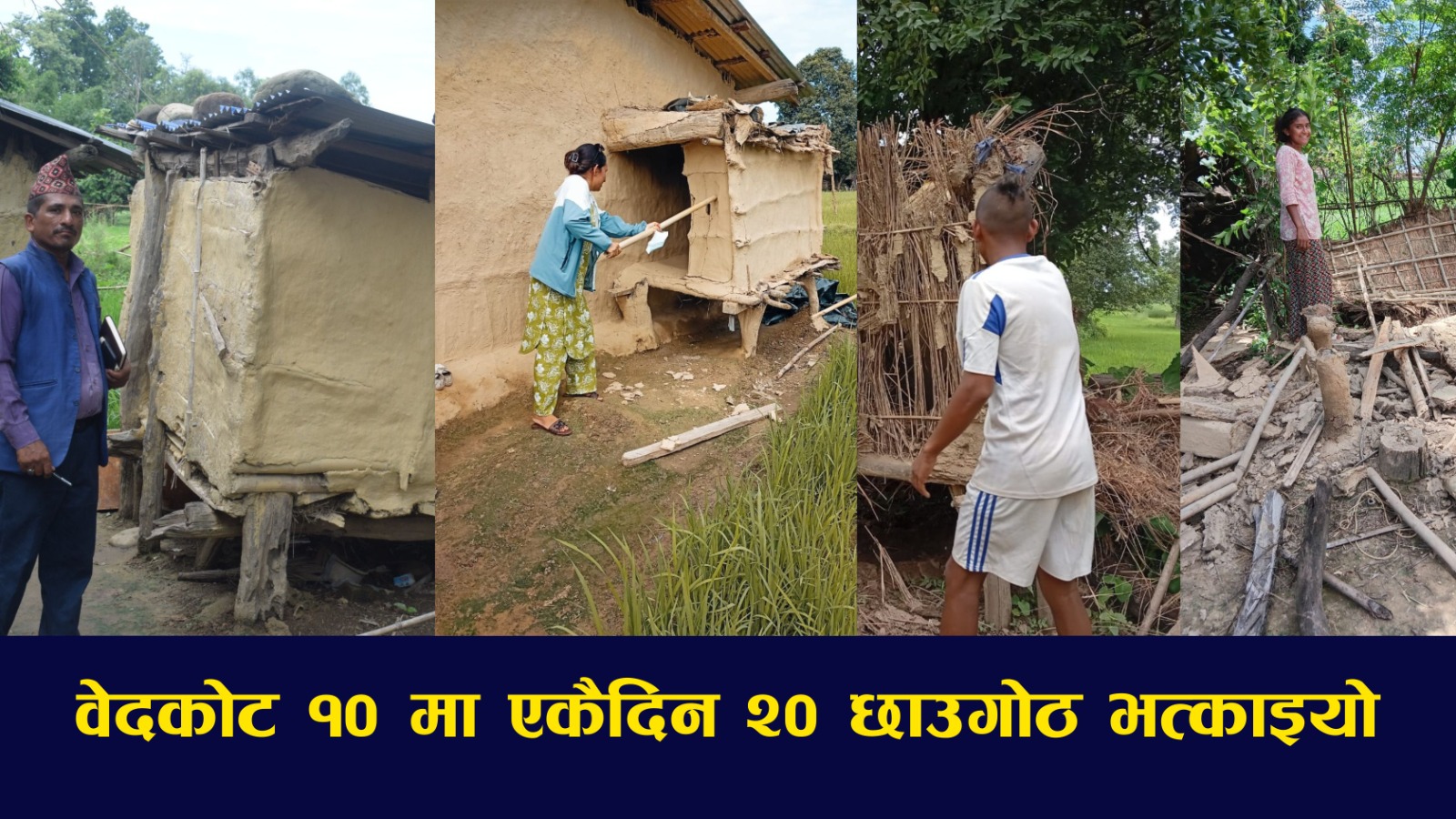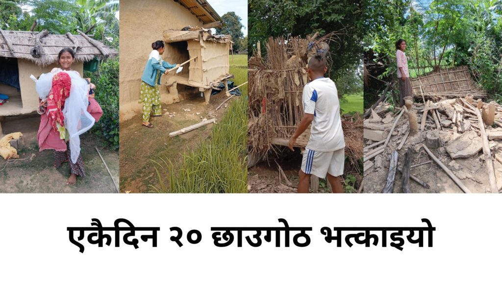कञ्चनपुर । कञ्चनपुरको वेदकोट नगरपालिका वडा नम्बर -१० मा शनिबार एकैदिन २० वटा छाउगोठ भत्काइएका छन्। वडा अध्यक्ष रतन सिंह बिष्टका अनुसार शनिबार वडाभित्रका २० वटा छाउगोठ भत्काइएको हो। उनले केही छाउगोठ भत्काउन बाँकी रहेको र ती पनि छिट्टै हटाइने बताएका छन्।