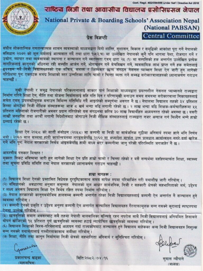 नेशनल प्याब्सनका अध्यक्ष सुवास न्यौपाने र महासचिव प्रकाशचन्द्र खड्काले एक विज्ञप्ति जारी गर्दै निजी विद्यालयहरूलाई विभेदरहित रूपमा समेट्नुपर्ने माग गरिएको छ। विज्ञप्तिमा संविधानको धारा १७(२च) र २५(१) मा प्रत्याभूत गरिएको पेसा, व्यवसाय र सम्पत्तिको हकलाई आत्मसात गर्दै निजी विद्यालयहरूले शिक्षामा पुर्याएको योगदानलाई राज्यले सम्मान गर्नुपर्ने उल्लेख गरिएको छ।