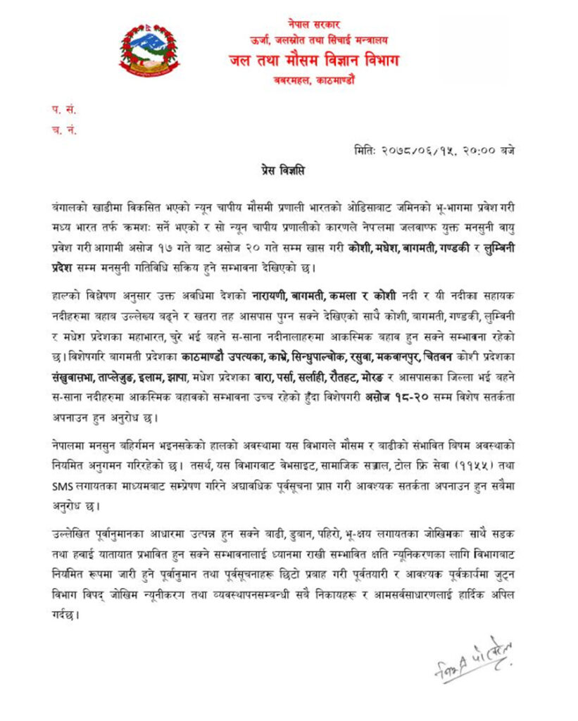 यही असोज १७ गतेबाट असोज २० गतेसम्म खास गरी कोशी, मधेश, बागमती, गण्डकी र लुम्बिनी प्रदेशसम्म मनसुनी गतिविधि सक्रिय हुने सम्भावना देखिएको छ ।