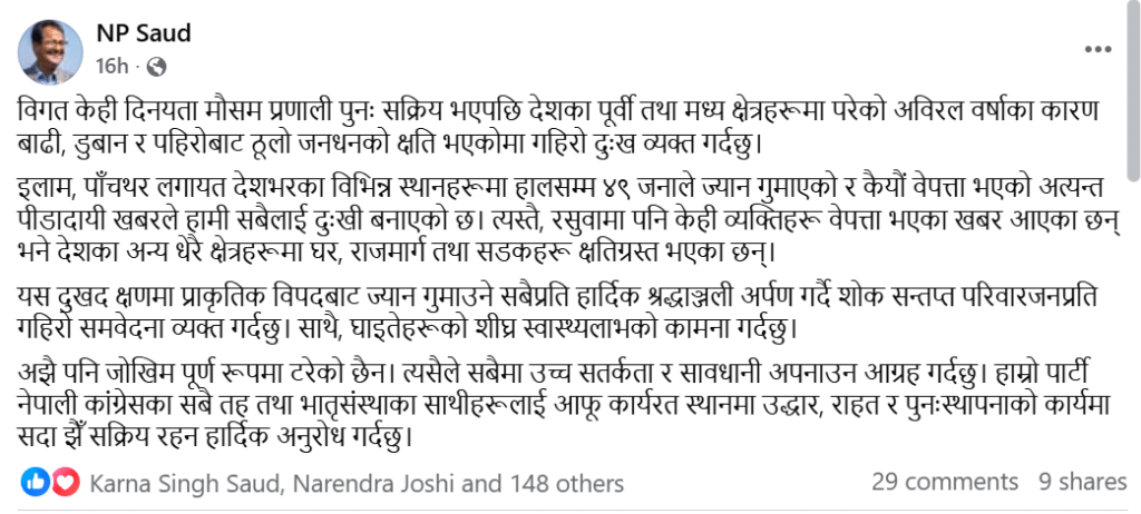 काठमाडौं – नेपाली कांग्रेसका केन्द्रीय सदस्य तथा पूर्वमन्त्री एनपी साउदले हाल देशभर भइरहेको अविरल वर्षाका कारण उत्पन्न बाढी, पहिरो र डुबानबाट भएको ठूलो जनधन क्षतिप्रति गहिरो दुःख व्यक्त गरेका छन् ।